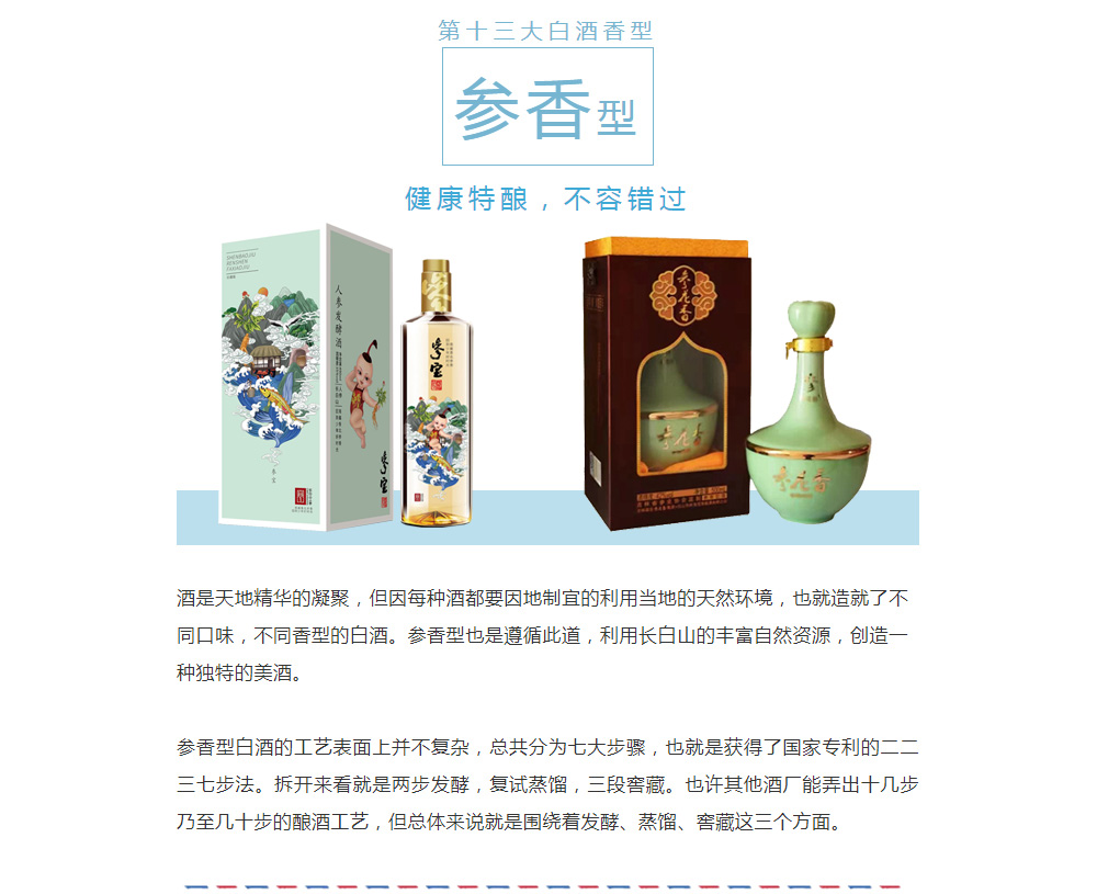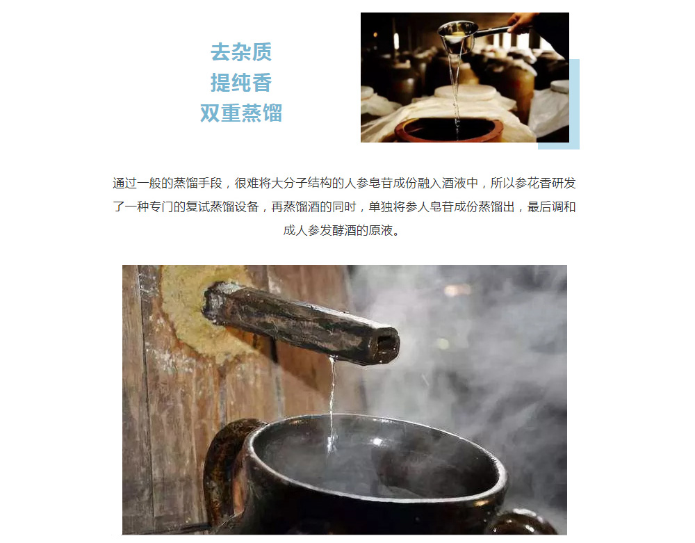 吉林森宝参花香集团,公司前身是“泉水酒坊”,有750年人参酒酿造历史,93年转型为股份制企业,2008年在泉水酒坊工作23年的丁政然先生收购泉水酒坊,正式成立参花香集团。将工厂迁至乾隆御笔长白山矿泉水水源地泉阳泉,成为一家能够生产人参发酵酒的企业。我们的人参酒也正式开启了专利保驾护航,使用泉阳泉矿泉水、长白山人参和东北粮食酿造人参发酵酒的标准模式。